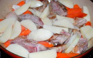 Svinjska rebra operemo, isečemo na komade na kostima i stavite u papriku. Luk izrezati na pola prstena, mrkvu – kolutove, oguljeni krompir – u 6 delova, beli luk – na pola.