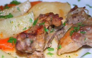 Stavite gotova mirisna rebra s povrćem na tanjir, pospite peršunom i poslužite sa svježim ili slanim povrćem i hrskavi hljeb.