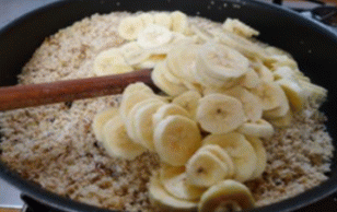 - Sklonite luk i brašno sa vatre, u masu dodajte kašike banana.