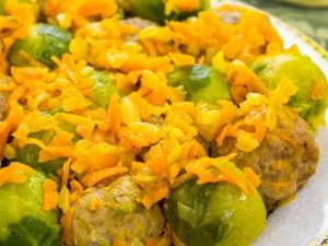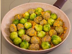 Briselski klice kuhani kod kuće s ukusnim mesne okruglice. Puna večera, dvoje u jednom, meso sa povrćem garniraj, priprema se lako i brzo.