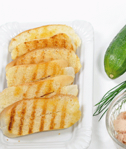 - Kriške bageta moraju biti premazane maslinovim uljem, pržite ih malo u tavi (na obe strane).