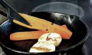 - Ogulite luk i mrkvu, prepolovite na pola po dužini. Pecite dalje u tavi. Krumpir zavijte u luk.