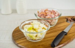 Pržite orahe u tavi bez ulja. Dimljeno meso odvojite od kostiju i zajedno sa jabukom oguljenom od sjemenki isjeckati na kockice, peršun – sitno.