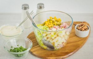 U posudu stavite pripremljeni poriluk, dimljenu piletinu jabuke, grašak i kukuruz. Dodajte peršin, majonez, sjeckani orasi, mljevena paprika, sol, dobro izmešati i odmah servirati.