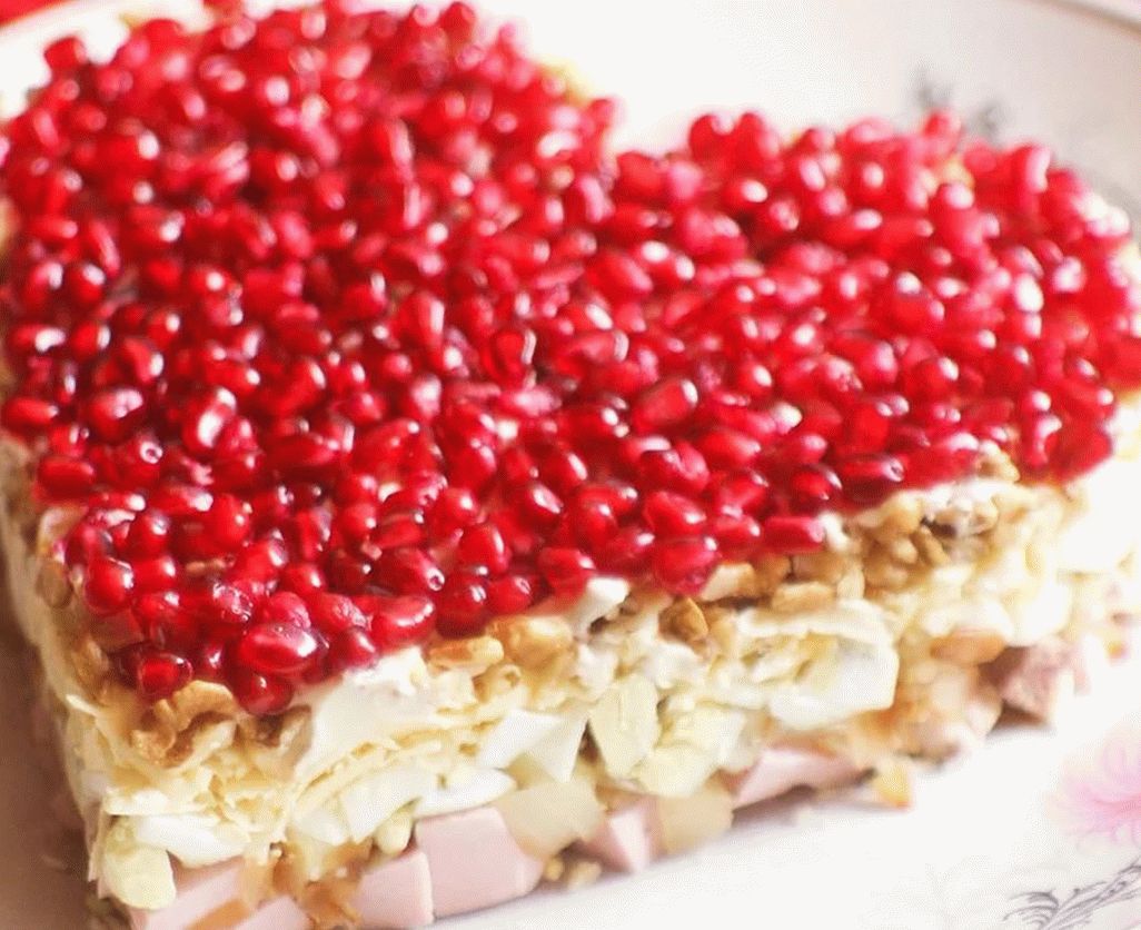 Salata se može napraviti u obliku prekrasnog srca, ako ga ima poseban oblik salate za to. Ali nemoj se uzrujati ako ovaj oblik nije, onda se salata može kuhati kod kuće cilindrom pomoću improviziranih sredstava.
