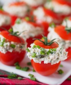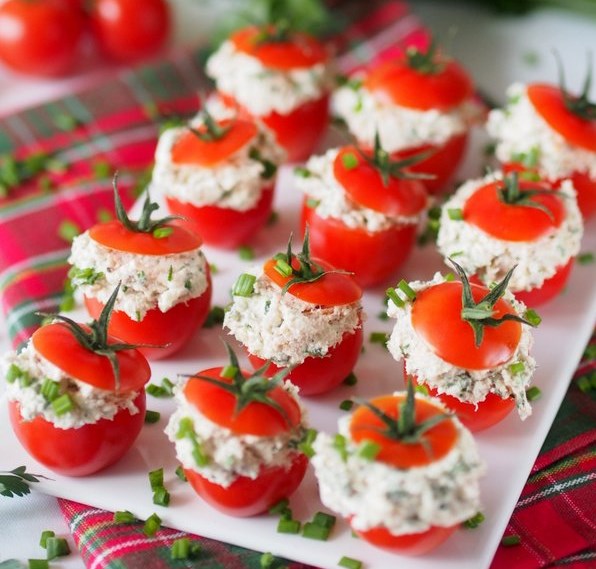 Ispunite šuplje cherry rajčice pripremljenom ribljom smjesom, poslati u jelo, posipati nasjeckanim zelenim lukom i zatvoriti poklopci reznicama. Prekrasno hladno predjelo odmah se poslužuje blagdanski stol.
