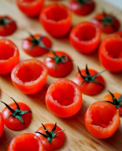 Šercijalnim škarama režemo rajčice s grana, tako da za ljepotu lijeve reznice. Odrežite poklopce i pažljivo uzmi kašu sa žličicom.