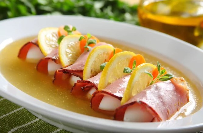 Stavite pripremljene peciva šunke u dve duboke 6 kom ploča i piletinu prelijte želatinom. Divno jellied poslati na hlađenje najmanje 3 sata, a zatim ukrasiti kriške limuna, mrkve, začinsko bilje i poslužite.