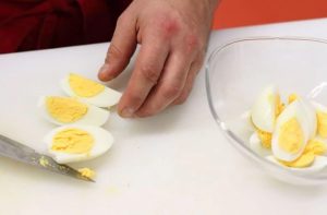 Jaja peremo sunđerom, kuhamo 8-10 minuta, ohladimo, oguliti i isjeći svako jaje na 4 kriške (ukupno 12 kom.).