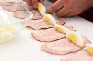 Tanke kriške šunke podmazane hrenom, s jedne strane dodajte krišku jaja, grančicu peršuna i pretvorite u rolne.