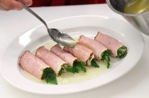 Pripremit ćemo originalne i ukusne domaće ćelije od kriški šunka punjena kuvanim jajima i grančicama peršuna. Takvu užinu možete napraviti za bilo koji odmor.