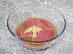- Dodajte nasjeckani beli luk. Meso nasolite tamo i ostavite u trajanju od 30-40 minuta.