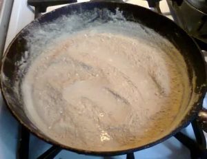 - Sada pripremite nadjev za Julien. U suvoj tavi popržite brašno, a zatim dodajte puter u brašno i promešajte ova smjesa. Napravimo nekoliko kašika kisele pavlake, soli, bibera. Donosimo prokuhajte uz stalno miješanje i kuhajte 2 minute.