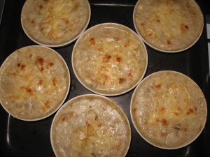 - Širite piletinu, luk i masline u proizvođačima kokota, dodajte sipajte i pospite naribanim sirom. Stavite kokos pećnicu pecite na 180 stepeni i pecite je vrlo kratko dok se sir ne otopi (oko 10 minuta).