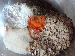 - U posudi pomiješajte povrtni pire, orašaste plodove, škrob, kašu, žitarice (pšenica, zob, raž, ječam), začini.