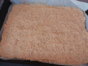 - Kalup za pečenje obložite pergamentom. Rasporedimo masu lim za pečenje. Poravnajte sloj debljine 4-5 mm, ako želite mekan peciva i 1-2 mm ako želite čips. Poslano na prethodno zagrejano peći na 25 minuta. Temperatura bi trebala biti 200 stupnjeva.