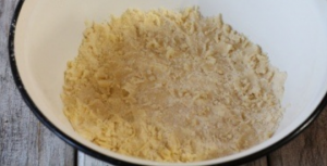 - Prosijte 200 g brašna, prethodno izmešanog u duboku posudu sa praškom za pecivo. Maslac samljeti na sitnoj rerni. Dodajte maslac i dodajte brašno gustom gustinu. Zamotajte folijom i privremeno stavite u frižider.