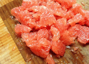 - Ogulite grejpfrut, uklonite sve vene u kriške i membrane. Potrebna je samo sama kaša, koju narežemo na kriške i povežite s piletinom.