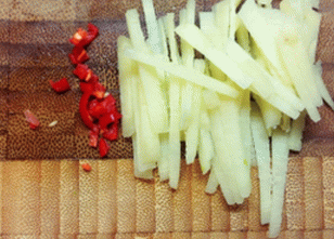 - Đumbir ogulite i narežite na elegantne duge trakice. Čili biber dodajte po ukusu sitno sjeckani.