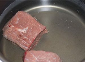 Nakon tog vremena, meso stavite u tepsiju, u koju treba sipati 2,5 litra vode i dodajte kocke juhe. Kuhajte na najmanje vatra 1,5-2 sata. Meso mora biti vrlo mekano.