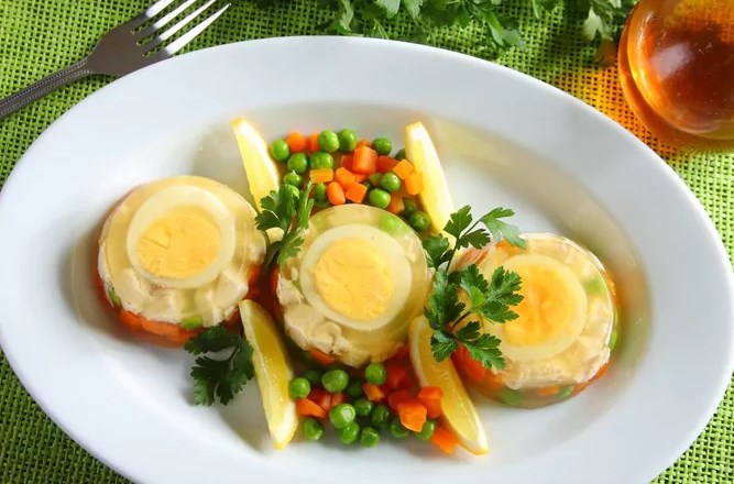 Odmrznuti grašak pomiješajte sa sjeckanom mrkvom. U jaja dodajte pileće kockice, biljnu mešavinu i zalijte juhom želatina. Šaljiv jelted u hladnjaku šaljemo 3 sata do pune očvršćavanje.