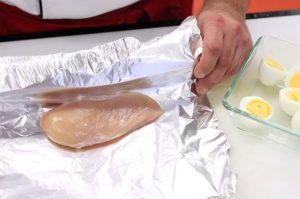Pileća prsa operemo, natrljamo solju, zamotamo u foliju i pecite na 180 stepeni 15 minuta. Ohladiti i nasjeckati kocke.