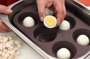 Pileća jaja skuhajte, ohladite, ogulite i prepolovite.