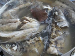 Sada počinjemo sa pripremom juhe. U loncu s vodom trebate staviti glavu, peraje i greben ribe. Kad je tečnost gotovo ključa, na površini se počinje stvarati pjena, što vam je potrebno pucaj razrezanom kašikom. Nakon toga morate dodati sve povrće (osim repe) i kuhajte luk oko 30 minuta, nakon 20 minuta dodajte lovorov list i sol. Izvadite sve sastojke iz tave, procijediti juhu.