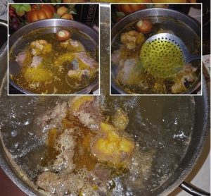 - Dijelovi zamorčića s mrkvom, lukom, lovorovim lišćem i Suho korijenje prelijte vodom i kuhajte nekoliko sati na laganoj vatri.