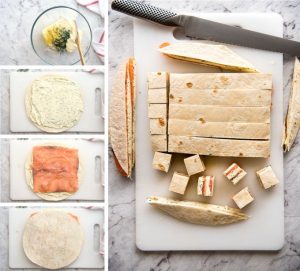 Zapanjujuće lijepo i ukusno predjelo tortilje od tortilje, dimljena crvena riba, krem sir i pavlaka sa dodatkom kopar, pripremite kod kuće za prazničnim stolom.