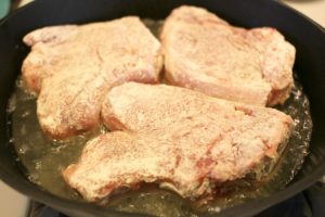 U vrućem ulju popržite pripremljene komade svinjetine (veliku količinu) i pržite sa dvije strane na srednje jakoj vatri 8-10 minuta.