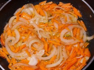 - Mrkvu i luk narezati na kockice, pržiti u tavi sa beli luk i začini na maslinovom ulju.