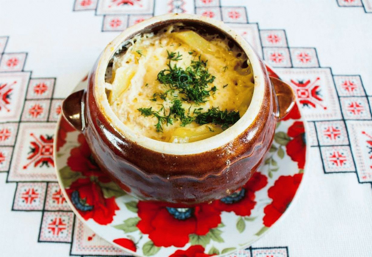 - Zidovi lonca su iznutra dobro podmazani kiselim vrhnjem. U njemu širimo 2/3 mesa s krastavcima, koji stavljamo po vrhu krompira. Na vrhu krompira napravimo “mrežicu” majoneza.