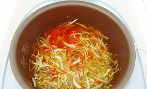 - U polagani štednjak podesite program prženja (5 min.). On suncokretovo ulje pasirati luk, šargarepa, paradajz. Konstantno miješati da se povrće ravnomjerno kuha.