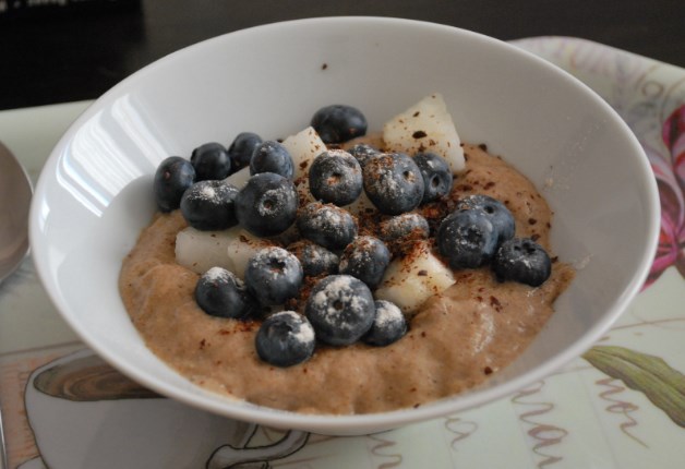 - Stavite kašu na tanjir, ukrasite breskvom na vrhu i borovnice. Pospite šećerom u prahu ili vanilijom.