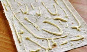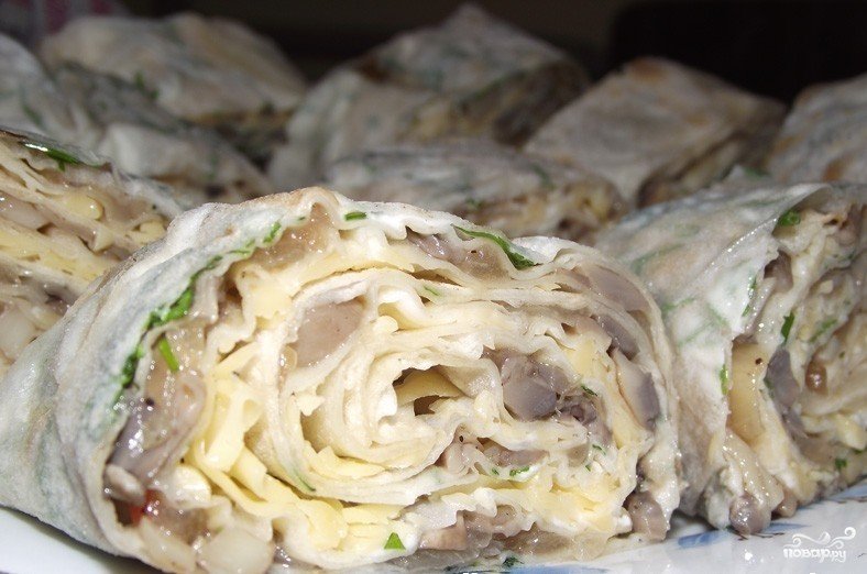 Oljuštite list pita hljeba majonezom, dodajte bilje, gljive s lukom i sir. Pokrijte sljedećim pita hljebom i ponovite sloj za punjenje. Ukupno listovi pita hljeba trebaju biti tri.