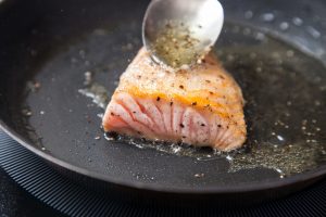 - Na šporetu zagrijavamo tavu s dodatkom povrća ulje, na njega šaljemo losos, sol i papar.