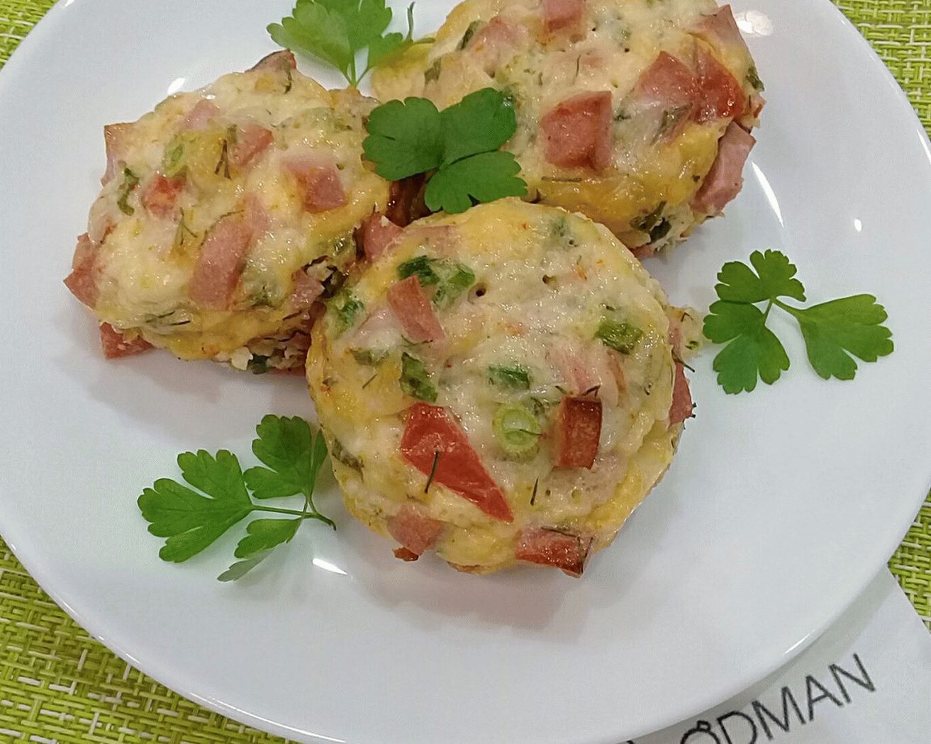 Ne-slatki muffini za doručak napunit će vas energijom u početku dana. Sastoji se od nježnog omleta, kuhanih kobasica, sa sirom aromatiziran je i nadopunjuje pikantnost i aromu paradajz, bilje i začini. Pa, ukusan doručak
