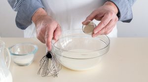 - Zagrejemo čašu mleka na oko 37 stepeni. Dodaj žličica šećera, prstohvat soli i kvasca. Mix i ostaviti na toplom mjestu, oblikovati se bujno “šešir”.
