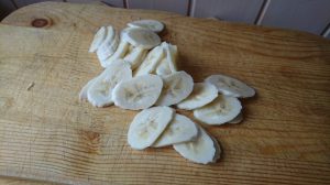 - Bananu narežemo na tanke ploške.
