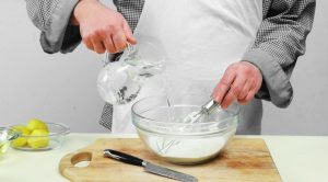 - Pomiješajte brašno sa solju, praškom za pecivo i sodom. Dodaj gazirane vode i šećera, mešati dok ne postane glatko.