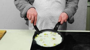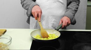 - Ogulite krompir i isecite ga na kockice, luk ogulite i takođe isjeckati na kockice. Zagrejati tavu sa uljem, namazati lukom i pržite 10 minuta, prebacite u posudu.