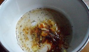 - Ogulite đumbir i beli luk. Đumbir beli luk kroz presu. U posudi pomešajte maslinovo ulje i začini.