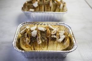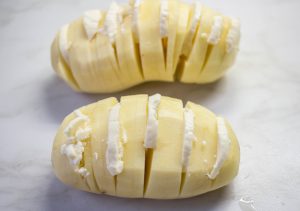 - Krompir ogulite i napravite rezove da se krompir pretvori u oblik “harmonike”.
