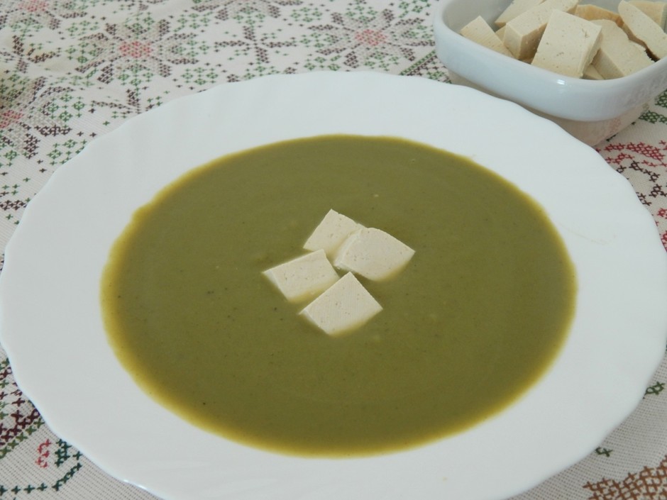 - Vruću juhu sipajte u tanjire i ukrasite kockicama sira tofu.