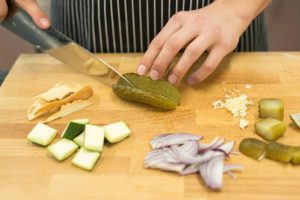 Češnjak snažno nasjeckajte ili naribajte. Sjeckani luk slamke i krastavci – u 8 dijelova. Tikvice oguljene sjemenke i isjeckajte ga na iste komade kao i krastavce.