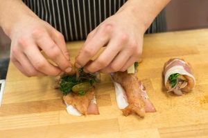 Stavite trak slanine na sto i komad ćuretine na njega fileti, na kojima je tostirani prženi kupus sa belim lukom i lukom, i takođe i krišku krastavca. Sve zamotajte rolicom.