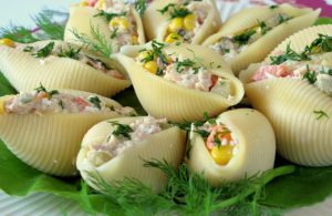 Originalna i ukusna zakuska od velikih ljuska tjestenina može biti kuhati kod kuće. Školjke punimo konzerviranom tunom, tvrdi sir, slatka paprika, kuvana jaja, kiseli krastavci i kukuruz. Napraviti takvo predjelo nije teško.