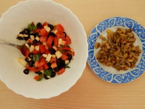 - Izrežite povrće i sir, sjedinite i dodajte papar, sol i preostalo maslinovo ulje.