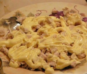 - Tri jaja na rerni i namaz. Vrh – majonez.